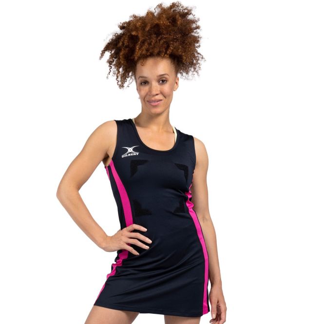 The classic Gilbert Eclipse II black and pink netball dress offers great all round performance. Mesh panels for ventilation and flattering shaped contrast panels for a slimmer appearance.